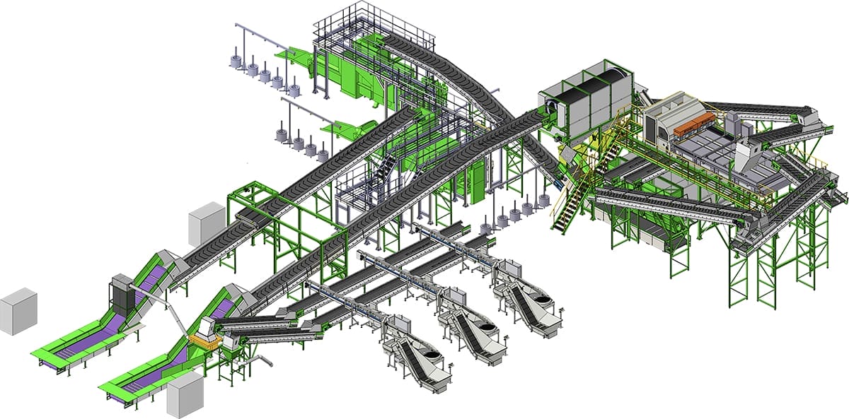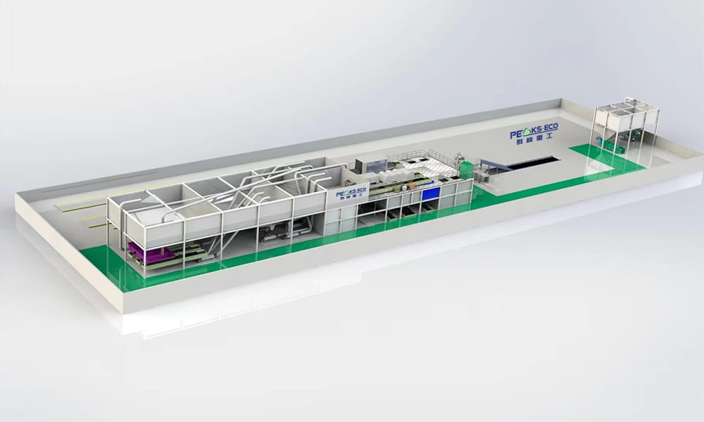 Para gerenciar com eficácia os resíduos recicláveis separados, a PEAKS-ECO desenvolveu uma linha de processo independente. Primeiro, os materiais recicláveis – papel, plásticos e latas de metal – são pesados automaticamente antes de entrar na sala de alimentação. O alimentador usa uma correia transportadora para separar os resíduos sólidos gerais por meio de separação física, seguida de pré-tratamento por meio de uma peneira rotativa. Separadores magnéticos e de correntes de Foucault extraem metais ferrosos e não ferrosos, respectivamente. Posteriormente, classificadores a ar separam papel e plásticos, enquanto a classificação óptica é usada para separar vidros coloridos.